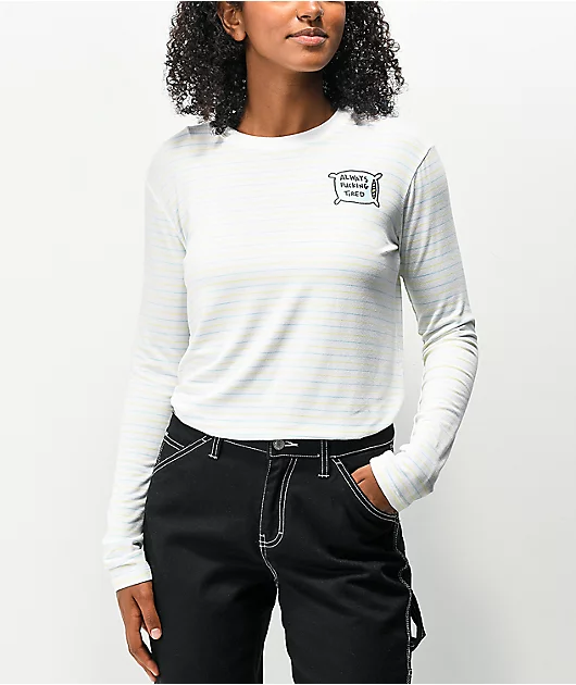 Slip some sleepy style into your shirt collection with JV by Jac Vanek’s Always Tired white stripe long sleeve t-shirt. The cozy rayon-and-spandex blend lends the shirt some soft, snuggly vibes, while pastel blue and yellow horizontal stripes throughout i