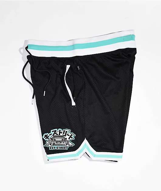These basketball shorts from Key Street come in a black colorway, featuring two zippered pockets and an adjustable drawstring waistline for a custom fit. On the left thigh is an embroidered tag of a street racing car with Japanese text above and the Key S