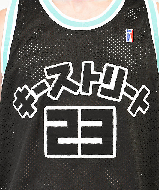 Adding a athletic streetwear-inspired look to your wardrobe, this black and blue basketball jersey from Key Street is sure to be a favorite. Made from breathable polyester mesh, the sleeveless silhouette has embroidery on the chest and back, while blue st