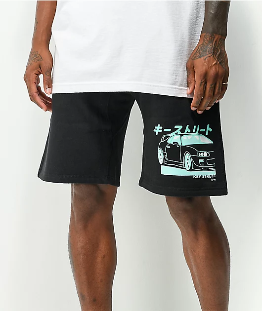 Step into something speedy with the Saiko black sweat shorts from Key Street! A stunning teal car graphic appears at the left leg opening, providing a ton of contrast against the black colorway beneath.