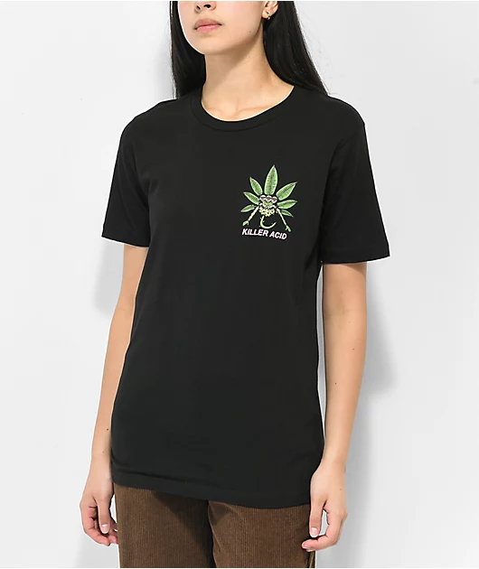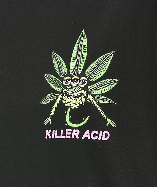 The Break On Thru Killer Acid t-shirt comes in black with a screen-printed weed leaf graphic on the left chest, and a large car and weed inspired graphic on the back. This Killer Acid tee is made from lightweight, soft cotton, and has a crewneck collar an