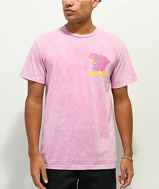 The Looking Through t-shirt from Killer Acid features a light pink acid wash throughout, giving each tee a unique look. The left chest has a bright pink graphic of an abstract face with its eyes popping out and \”Killer Acid\” bellow in yellow lettering. T