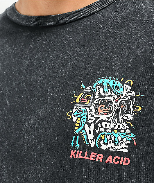 Peak the door open to the not-too-distant future with the World Goes On washed black t-shirt from Killer Acid. This tee has a black tie-dye wash, and features Killer Acid logo text with an occupied, melting skull at the left chest, while the larger graphi