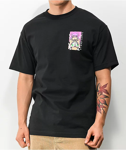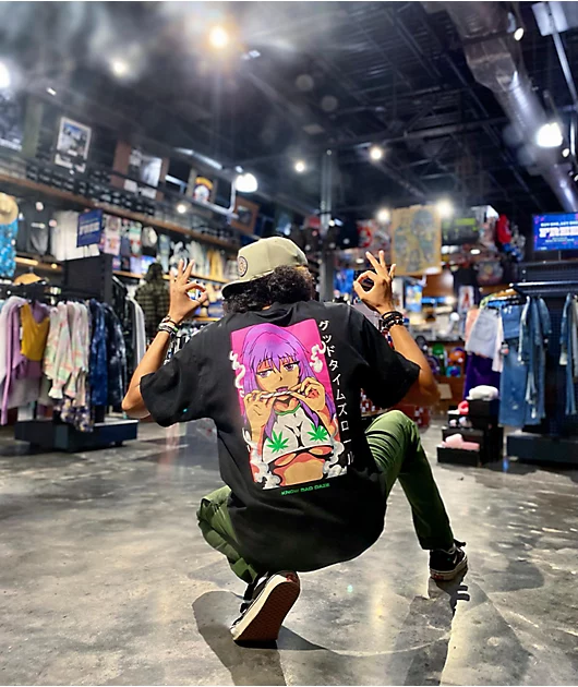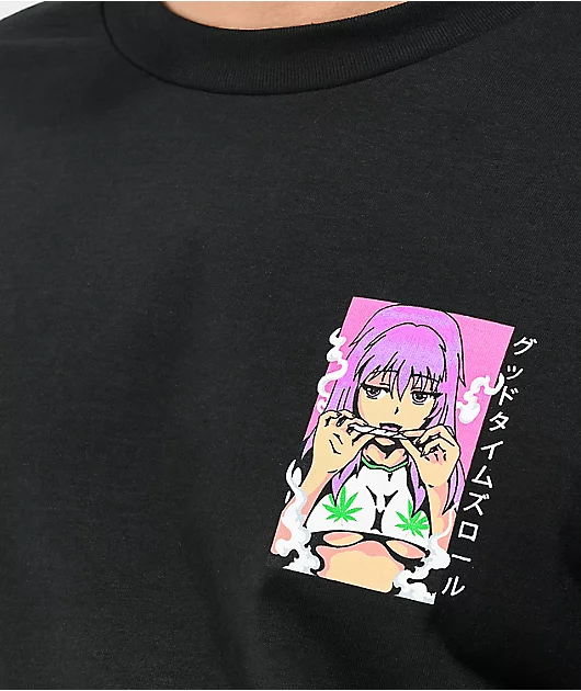 Elevate your steezy ‘fits with a little help from the Good Times Roll black t-shirt from Know Bad Daze. This tee has a black colorway, and features a graphic on the backof a pink haired, beautiful, exquisite anime women seductively rolling a joint for a l