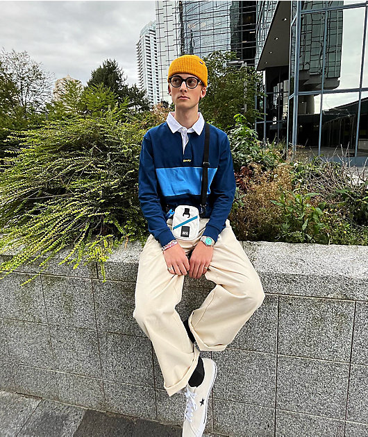 Add some visionary vibes to your everyday ensembles with the Eyes navy and blue rugby shirt from Krooked! With long sleeves and a relaxed fit, this shirt offers up plenty of casual style, while the fold-over collar and 3-button placket lend the look some