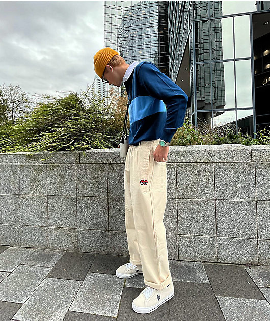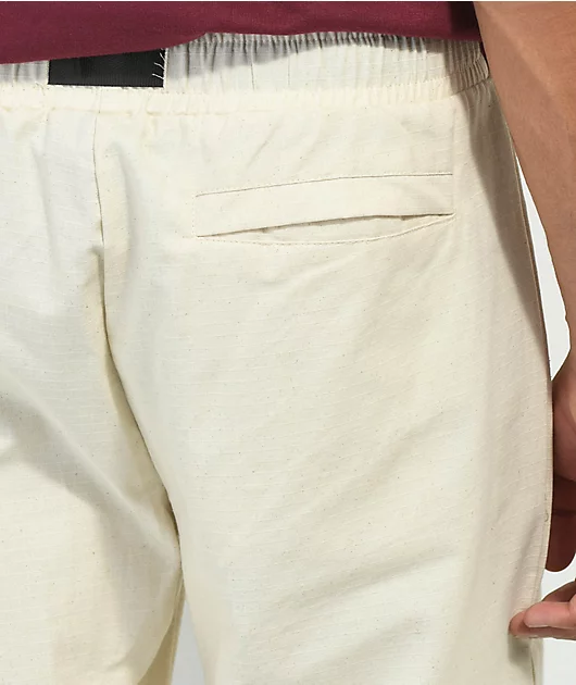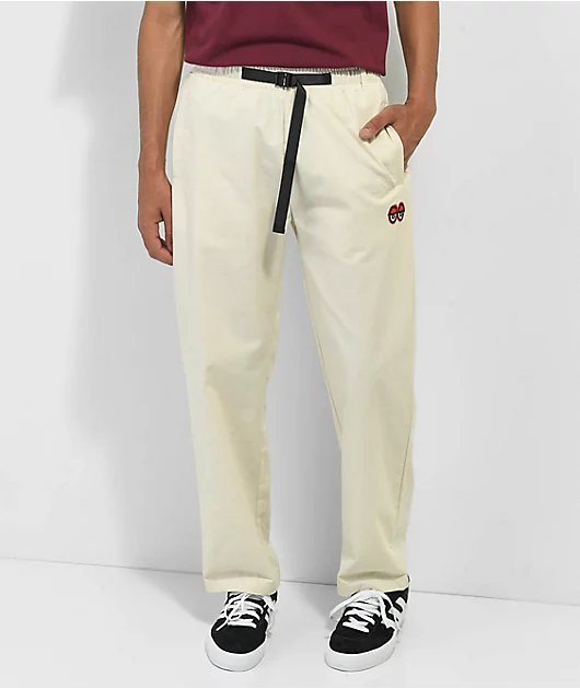 From Krooked comes the Eyes elastic waist pants in a white ripstop construction. Easily paired with casual outfits, the sturdy cotton skate pants have a straight leg silhouette, and features red Krooked embroidery on the left hip. With an elastic waistban