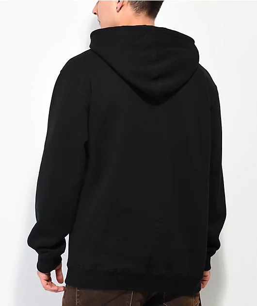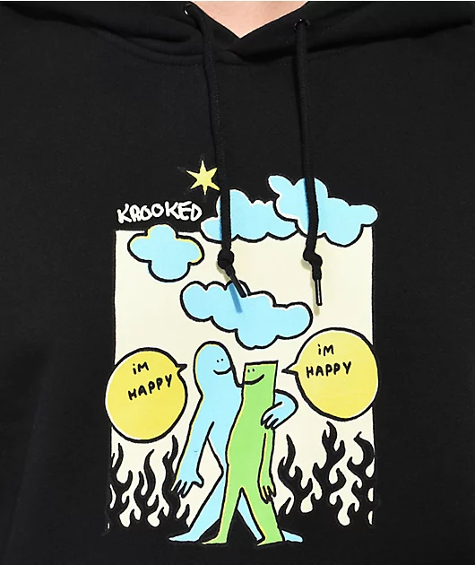 From Krooked comes the Happy hoodie, in a black cotton construction with a graphic designed by skateboarding icon Mark Gonzales on the front. Two cartoon figures walking through flames, both saying \”I’m happy\” can be seen on the front. Made from a durable