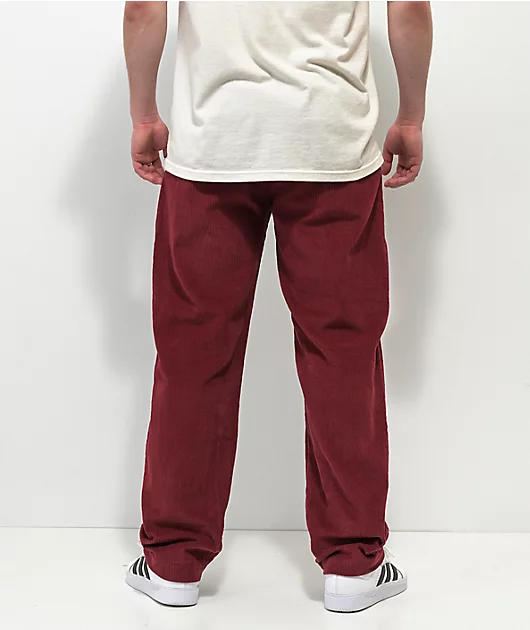 The Kords Krooked skate pants come in a burgundy corduroy construction with a drawstring-adjustable elastic waistband and a slightly tapered, straight leg as well as a 3-pocket construction with a zippered pocket on the back right side. These loose pants