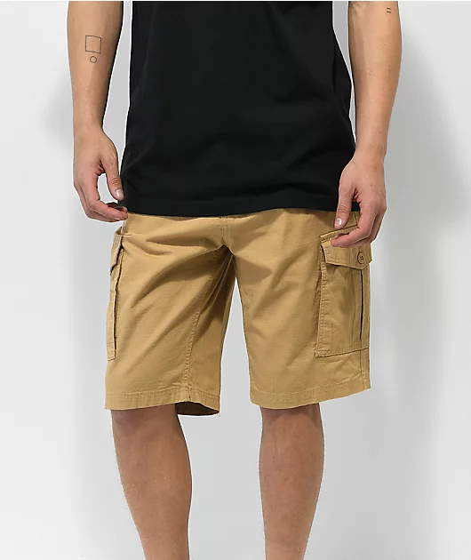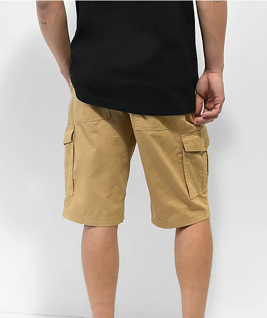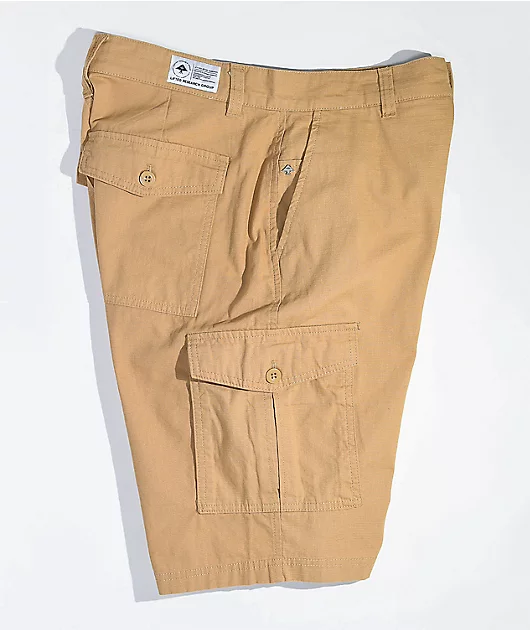 The RC Ripstop cargo shorts from LRG in the khaki colorway feature a 7 pocket configuration with buttoned pockets on both thighs and the back, hand pockets to the side, and a stash pocket decorated with a metallic LRG logo. The fatigue-inspired ripstop co