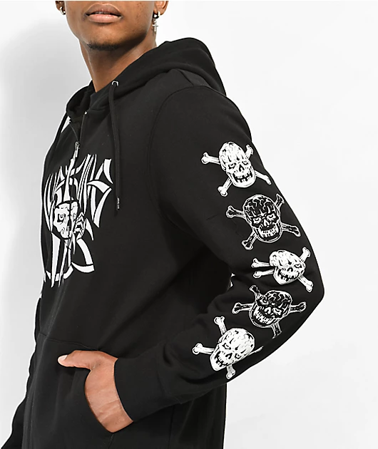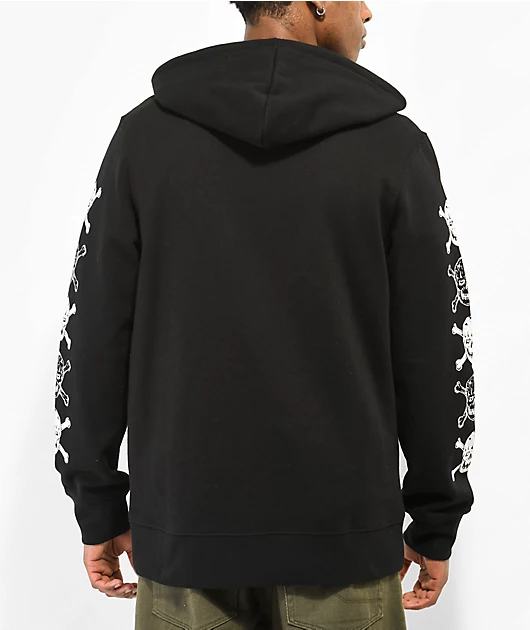 The Bones zip hoodie from Lurking Class by Sketchy Tank comes in a solid black colorway, with striking embroidered branding across the chest. With skull and crossbones graphics printed along both sleeves, the black sweatshirt is finished with a full zip c