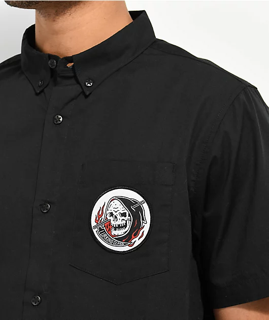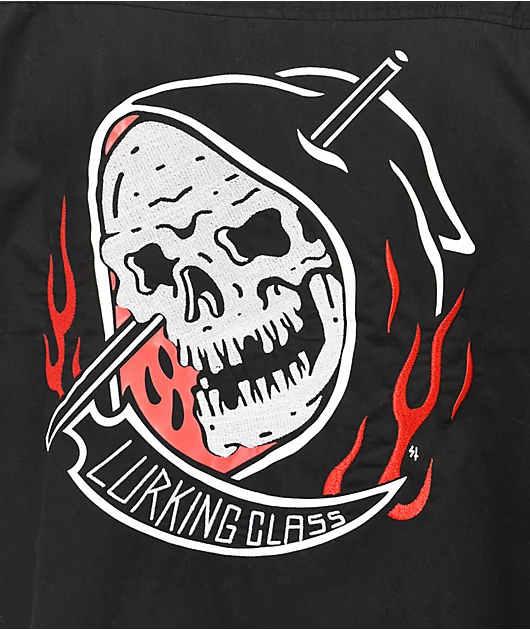 In an easy to pair black colorway comes the Certain work shirt from Lurking Class by Sketchy Tank, showing off a brand patch on the left chest pocket and colorful embroidery on the back of a hooded reaper. This button-up shirt is made from a durable cotto