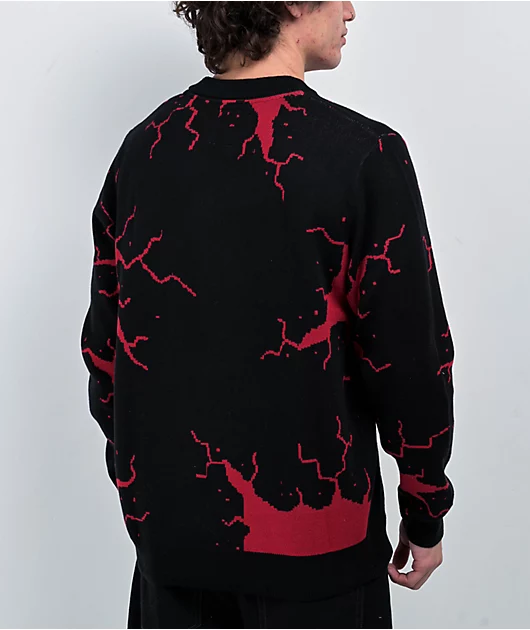Stay warm and cozy with the Lurking Class by Sketchy Tank Cracked black knit sweater. This graphic crew neck sweater features a knitted skull peeking through a crack in red and white, offering an omin