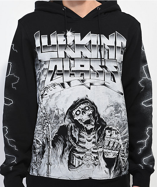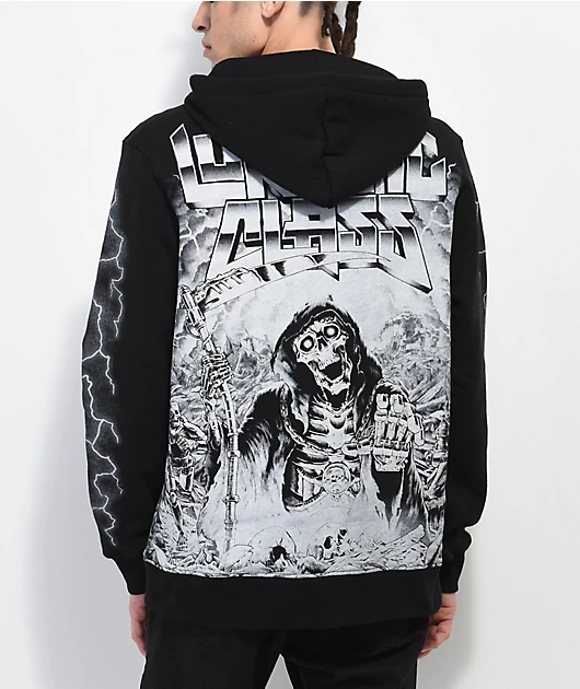 In a black colorway coms the Cyborg hoodie from Lurking Class by Sketchy Tank, showing off the detailed image of a cyborg grim reaper reaching out towards the viewer as even more cyborg skeletons emerge from a desolate wasteland. The brand name is set abo