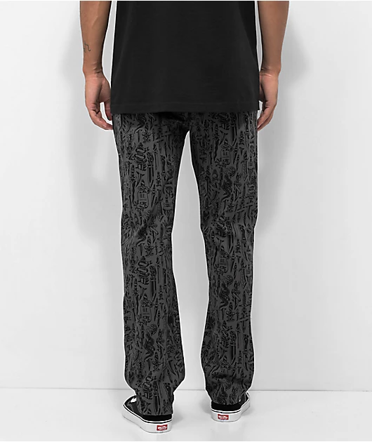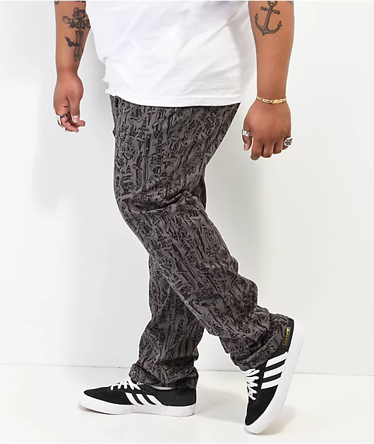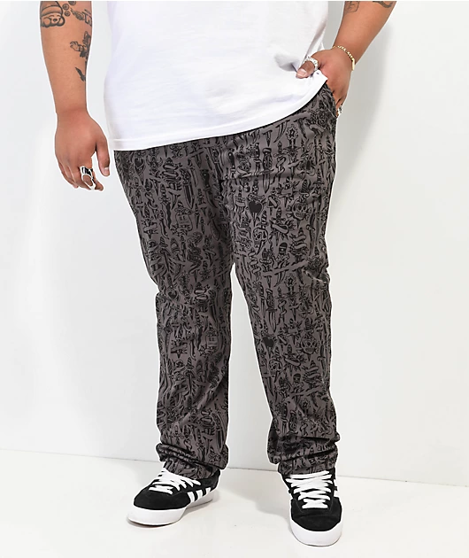 The Dagger pants from Lurking Class by Sketchy Tank come in a grey colorway with the images of daggers sublimated throughout in black for contrast. These unique pants feature an elastic waistband with an adjustable drawstring for a custom fit, coming comp