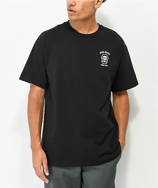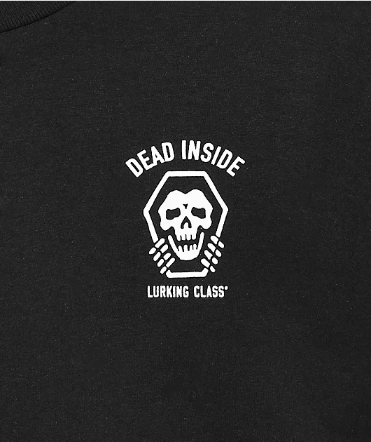 The Dead Inside t-shirt from Lurking Class by Sketchy Tank comes in black colorway and short-sleeve silhouette. Screen-printed on the left chest is a cloaked grim reaper with script above reading \”Dead inside\”, while the back bears the same script, along