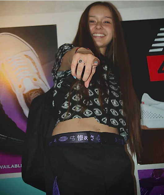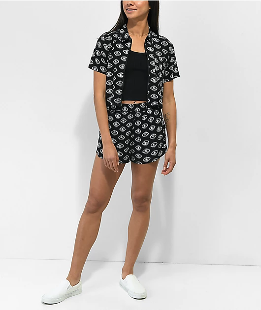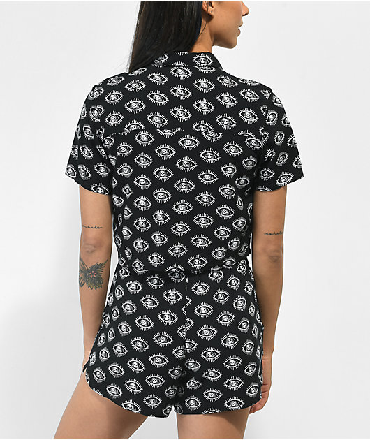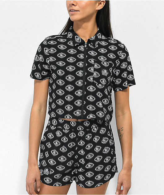 The Eyes crop shirt from Lurking Class by Sketchy Tank has a black colorway with sublimated allover graphics of eyes. This Lurking Class woven short sleeve shirt has a zip up closure, a turndown collar, and a cropped, boxy fit that cuts above the waistlin