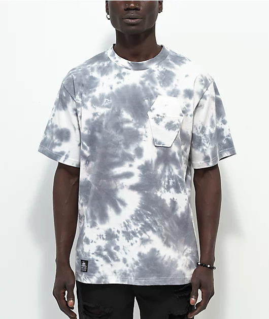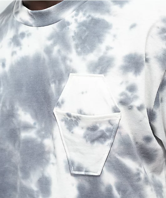 The Laugh Now t-shirt from Lurking Class by Sketchy Tank comes in a white colorway with a grey tie dye treatment and a screen-printed graphic of two smiling theater masks with skull faces on the back. The front of the shirt features a coffin-shaped pocket