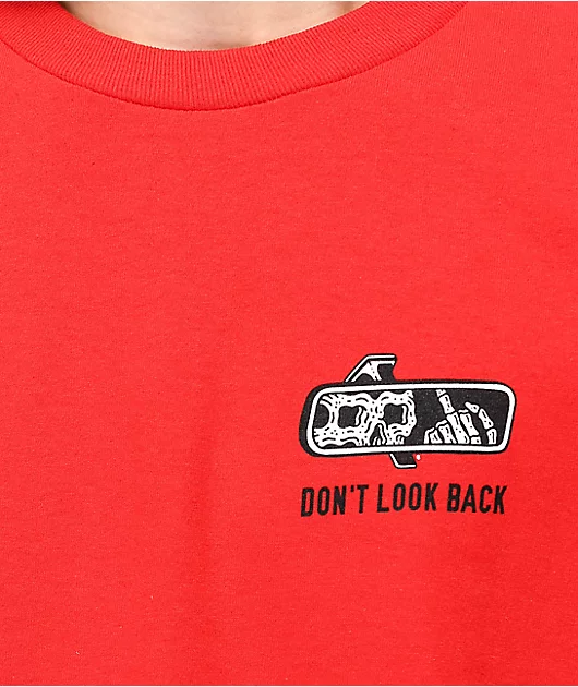 Watch where you’re going with the Look Back red t-shirt from Lurking Class by Sketchy Tank. This red tee features a rear-view mirror graphic featuring a Lurker flipping the bird across the back, and at the left chest. This red tee is the perfect, stylish