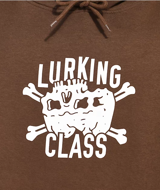 In a brown colorway comes the Lowered Expectations hoodie from Lurking Class by Sketchy Tank, showing off the brand name and the image of a skull and bones on the chest; with the image of a skeleton drinking and smoking as they relax in their grave on the