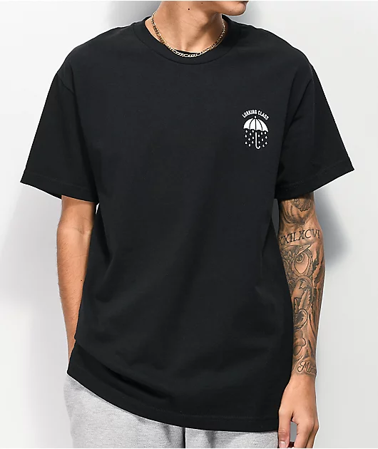 Shake up your tee collection in tattoo-inspired style with the Lurking Class by Sketchy Tank Rains It Pours black t-shirt. A screen-printed umbrella on the left chest in white with rain falling from the interior adds a fresh splash of style, while the lar