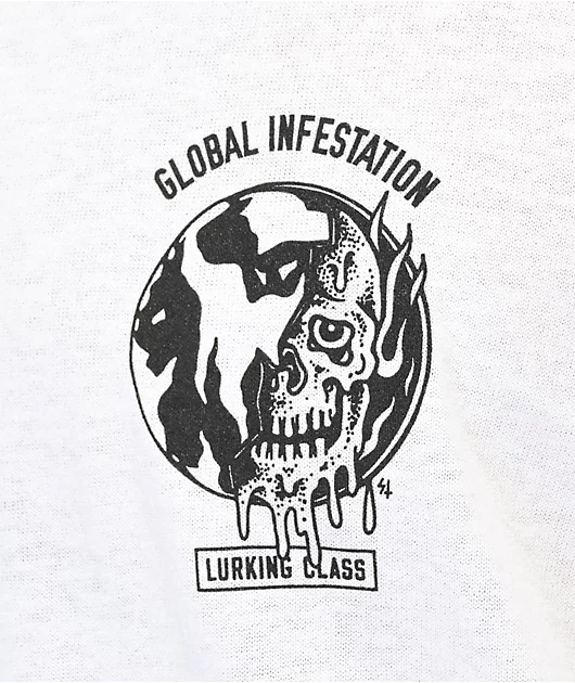 The Lurking Class by Sketchy Tank Rotten t-shirt comes in a white colorway and is constructed from soft yet durable cotton. The tee features a dual graphic at the left chest and back of the Earth with the Lurker Grim Reaper face taking over half of it, an