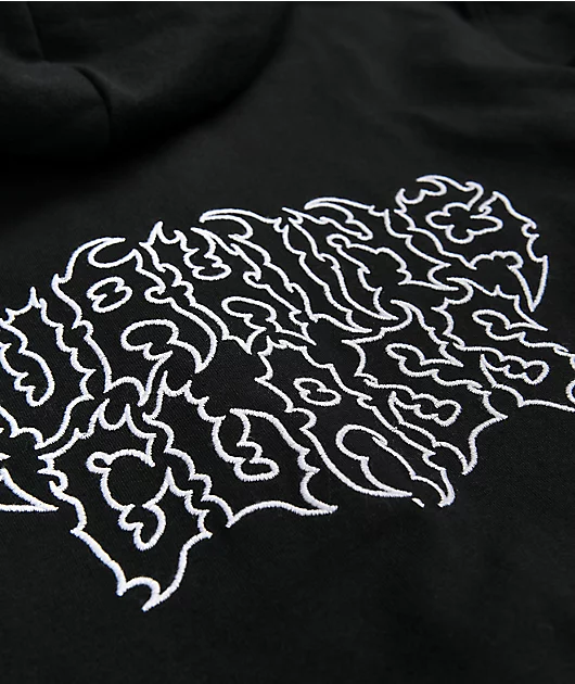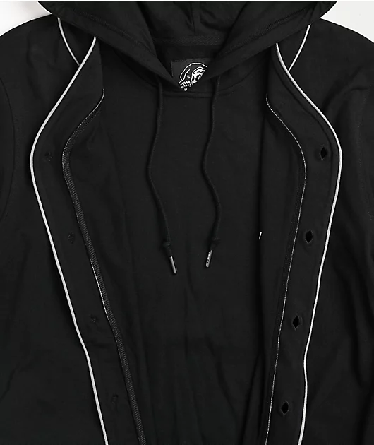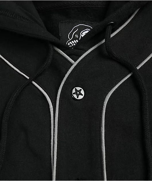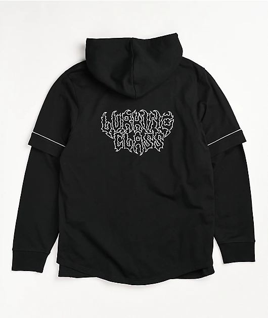 Add a couple fun looks into your arsenal with the Scythe layered black baseball hoodie from Lurking Class by Sketchy Tank! This hoodie features a traditional sweatshirt silhouette with a black baseball jersey overlaid. The Lurking Class script embroidery