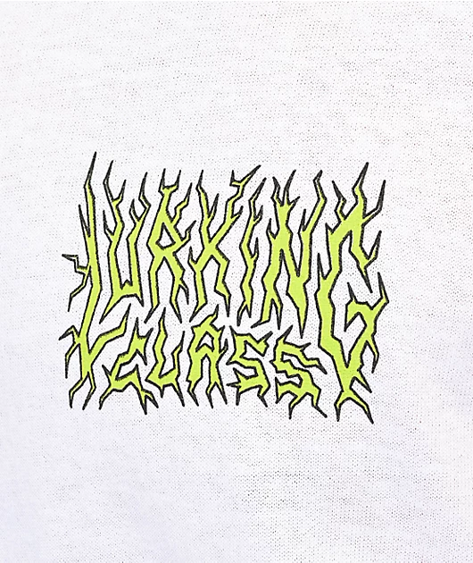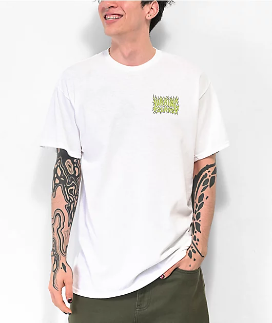 The Sewer white t-shirt from Lurking Class by Sketchy Tank boasts a screen-printed graphic at the back of the Lurker Grim Reaper covered in slime while crawling out of a sewer, and logo script at the left chest.