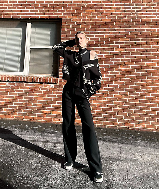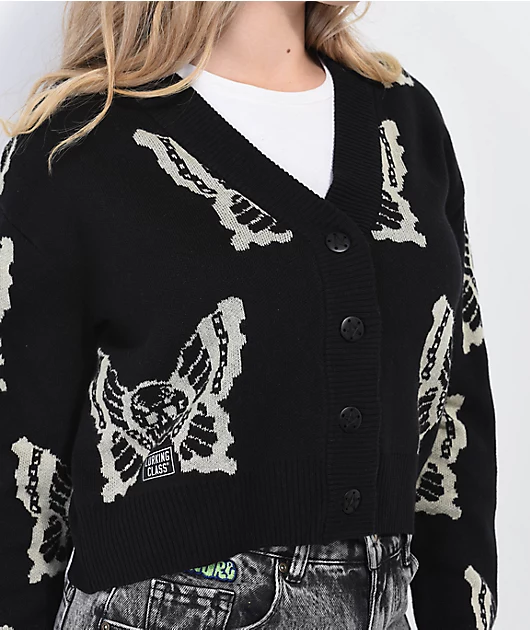 From Lurking Class comes the Skullfly cardigan in a black and white knit construction. With a stylish cropped design, the soft sweater features a butterfly pattern with skulls sublimated throughout. With a button up closure, and ribbed accents for comfort