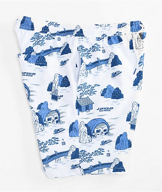 The Tucks board shorts from Lurking Class by Sketchy Tank come in a white colorway with sublimated graphics throughout of a reaper figure looking over a waterfront Japanese community. Adorning the bottom left leg, right above the hem, is an embroidered Lu