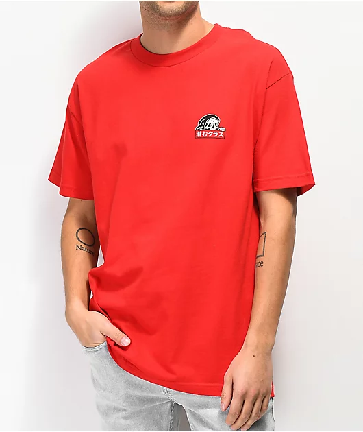 Get a look inspired by a combination of American tattoo art and the street art of Singapore with the Lurking Class By Sketchy Tank and Mr. Tucks Lurker Red T-Shirt. This relaxed fit tee features a small logo graphic on the left chest, as well as a large g