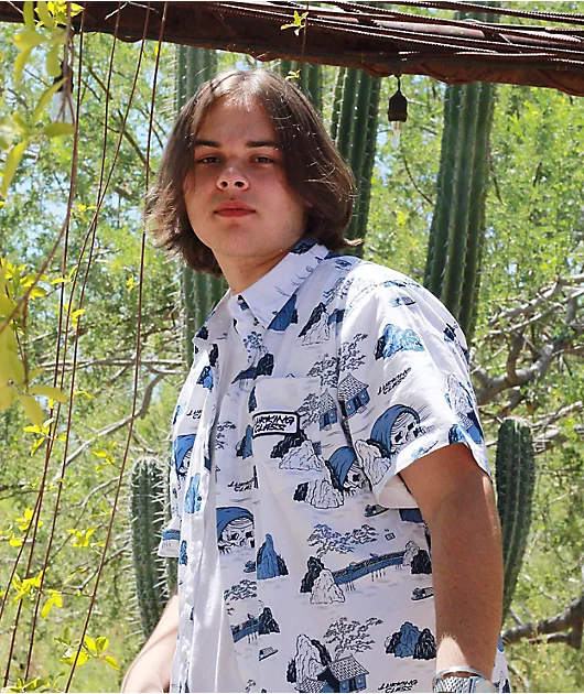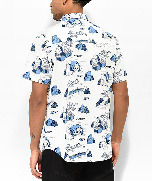 The Mr. Tucks button up shirt from Lurking Class by Sketchy Tank comes in a white short sleeve construction with blue Japanese-inspired graphics throughout in a contrasting blue. This 100% cotton shirt features a classic turndown collar, a rounded bottom