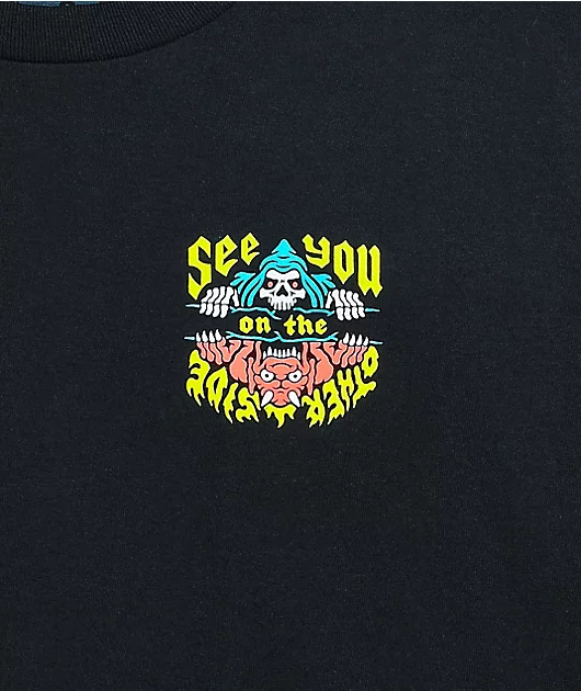 Adjust your wardrobe from stun to kill with the Other Side black t-shirt from Lurking Class by Sketchy Tank x Tallboy! The up-and-coming street artist Tallboy lends his design chops to this unique Lurking Class design, which features some eyeballs, monste
