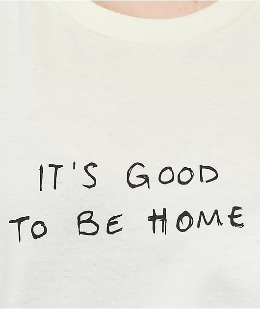Fabricated using extra soft light weight cotton, the Good To Be Home t-shirt by Melodie comes in a natural cream colorway. With original artwork by Melodie Perrault, hand-written text reading \”It’s good to be home\” is screen-printed on the chest in black,