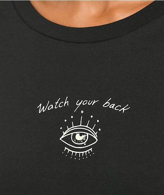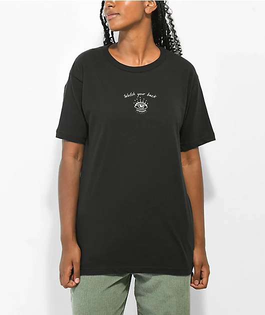The Watch Your Back t-shirt from Melodie comes in a black colorway, featuring a white screen-printed graphic of an eye with text reading \”watch your back.\” The back of the shirt depicts a woman’s back, with the eye motif repeated. Fabricated from soft 100