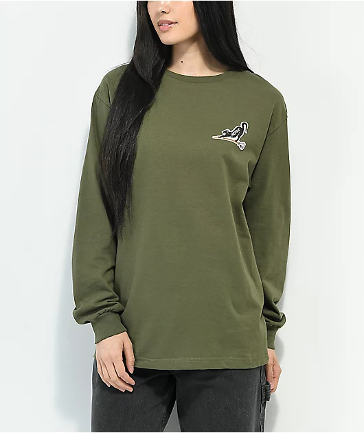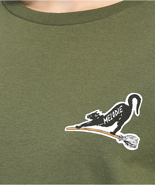 From Melodie by Melodie Perrault, the Witch Season Green Longsleeve T-shirt is screenprinted with the artist’s work such as the black cat stretching on a broomstick on the front, and the eerie graphic of a witch on her throne surrounded by orange bubble