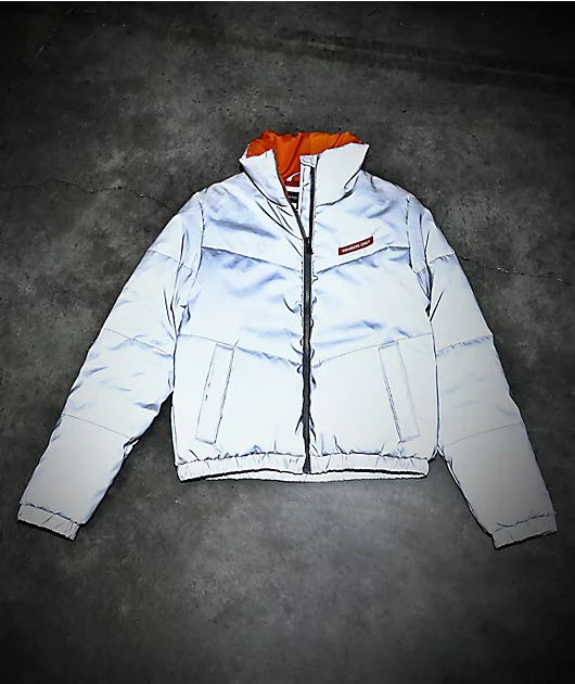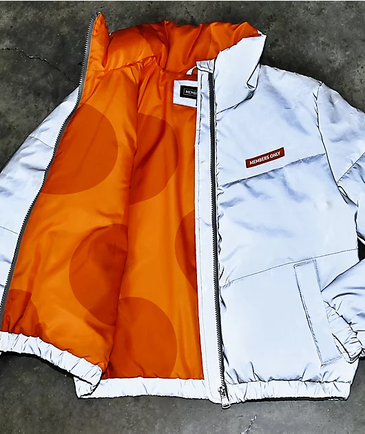 Add some high-visibility style to your winter wardrobe with the Hi Shine silver reflective puffer jacket from Members Only! This jacket features a super-shiny silver shell, designed to reflect light for amplified visibility in dark conditions, while the t