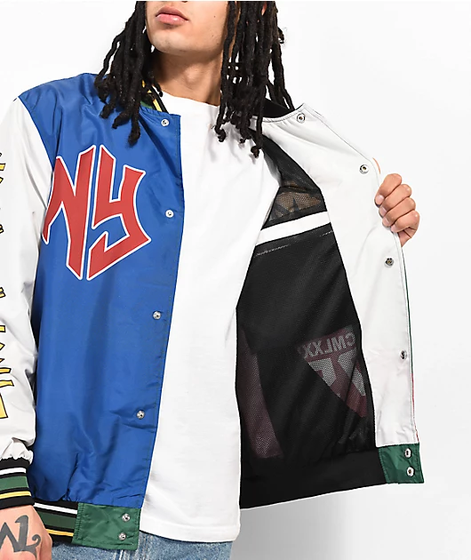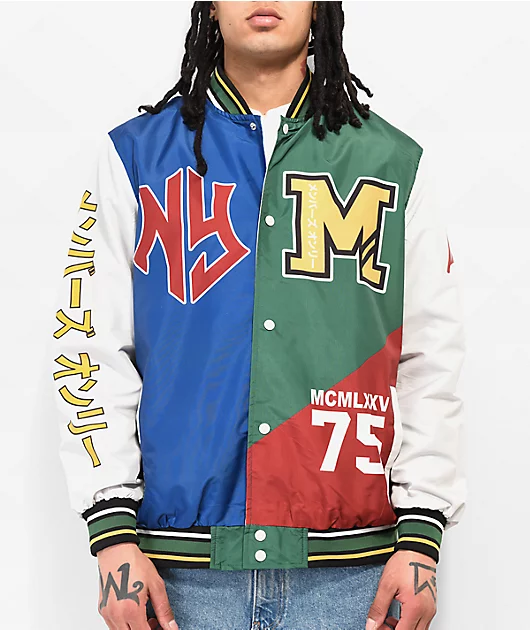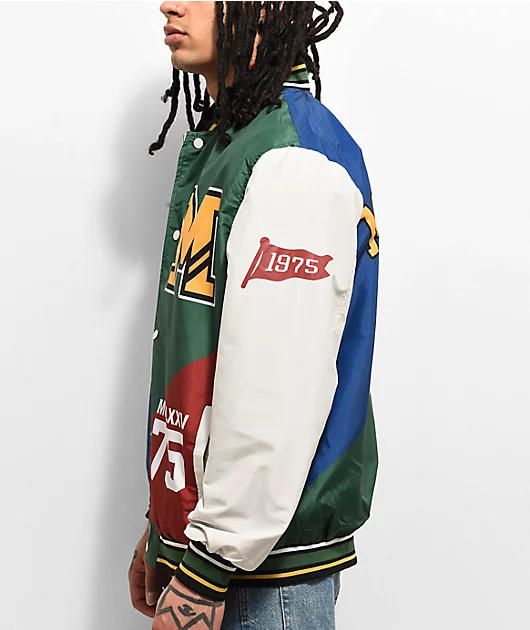 From Members Only comes the NY letterman jacket, offering an eye-catching style with color blocking in blue, green and red. This stylish jacket shows off screen-printing throughout including the brand name on the back for all to see, offering easy layeri