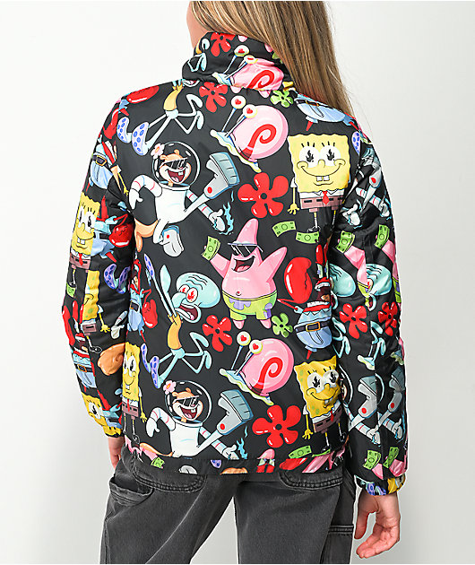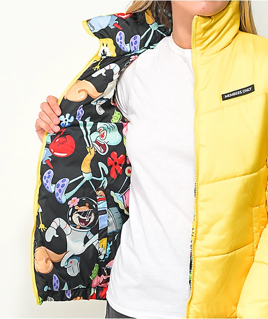 Make a statement in the Members Only x Nickelodeon hi-shine yellow puffer jacket! This bright yellow puffy jacket bears a sublimated graphic of SpongeBob’s face on the back, while the black interior showcases the whole gang throughout. It’s constructed of