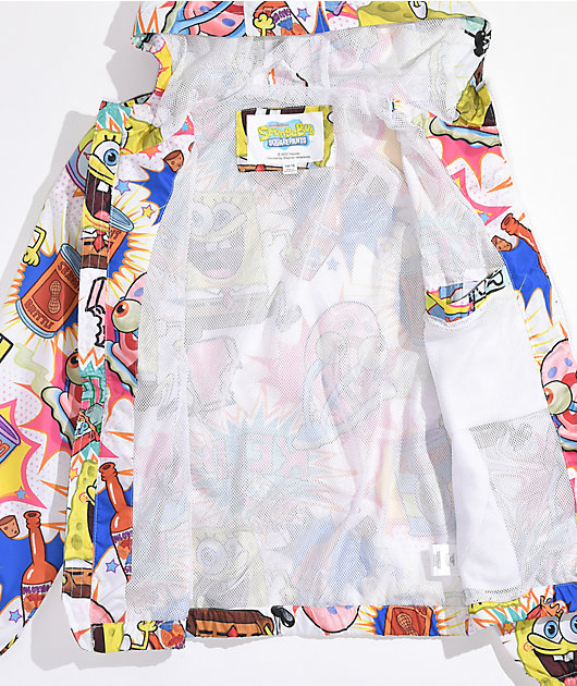Nickelodeon collaborates with Members Only for the Spongebob white windbreaker in kids sizing. This kids Members Only jacket features an all over sublimated print of Spongebob Squarepants, Gary the Snail, kelp nougat crunch,and vocano hot sauce. With a fu