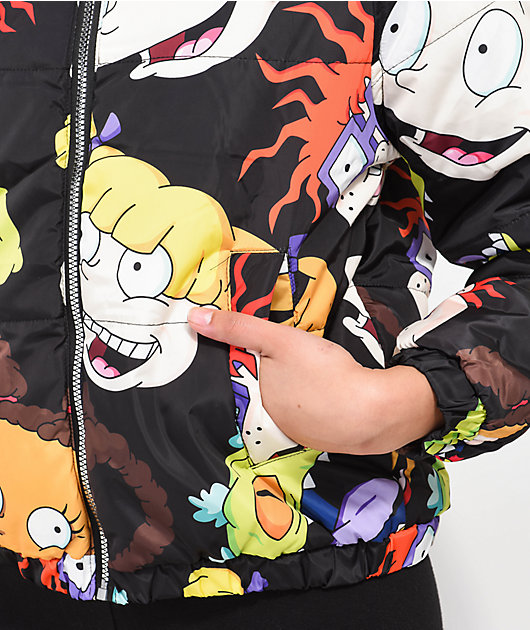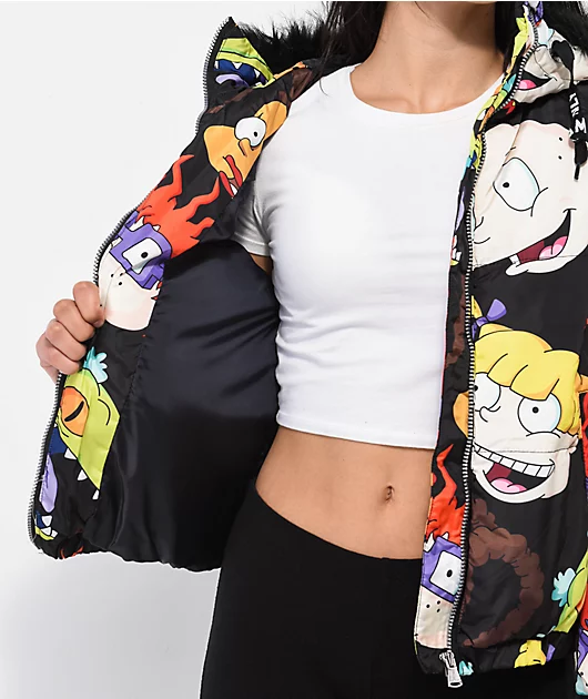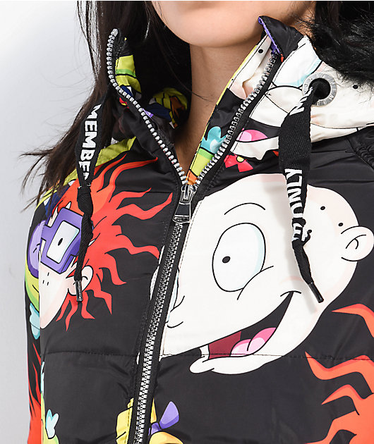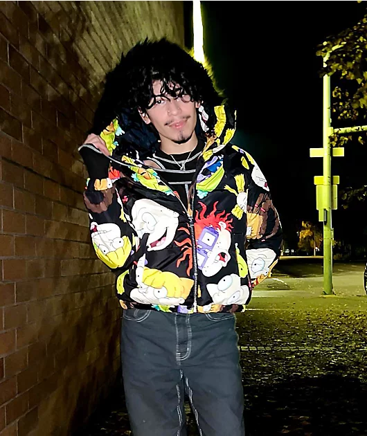 The Rugrats bomber puffer jacket from Members Only x Nickelodeon features all over print of the well-known and loved Rugrats kids for a throwback look that’s stylish and functional. This polyester jacket has a faux fur hood with adjustable drawstrings whi