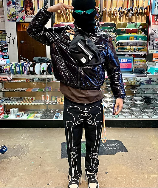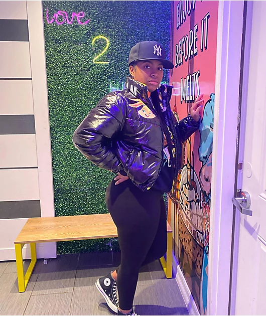 Ball out in cartoonish style with the Members Only x Space Jam A New Legacy Hi Shine black puffer jacket. This shiny black jacket comes with a mock neck collar and classic puffer construction for serious coziness points, while the mixture of Looney Tunes