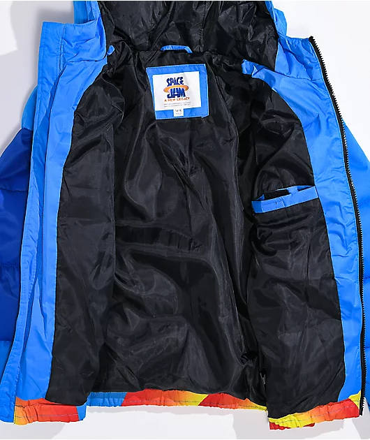 Give chilly weather a run for its money with the Members Only x Space Jam blue puffer jacket for kids! This heavily-insulated puffer jacket has two slash pockets, a full-zip closure, an internal pocket, and hood, perfect for keeping you stocked up and pro