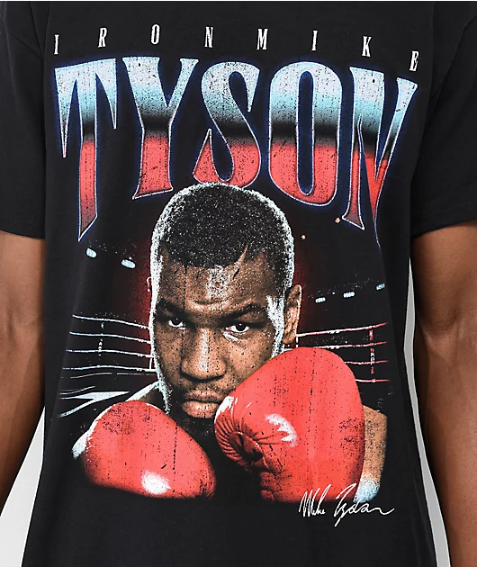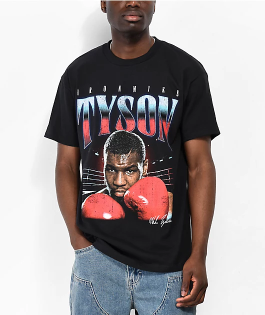 Made of 100% cotton, the In The Ring t-shirt from Mike Tyson comes in a black colorway with a graphic of Tyson in the ring under script that reads, \”Iron Mike Tyson\” on the front.