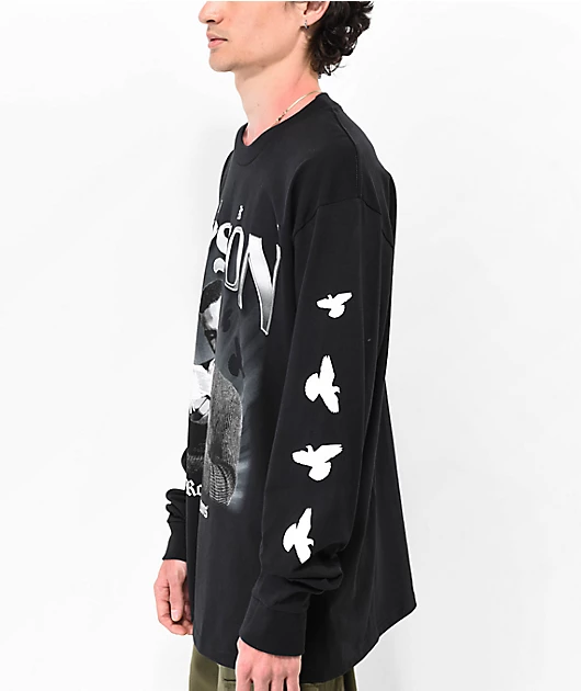 The Rolling Pigeons t-shirt from Mike Tyson comes in a black, long sleeve construction, boasting a front graphic of Tyson holding two pigeons close together with bird outlines screen-printed down the left sleeve. This 100% cotton t-shirt features a regula