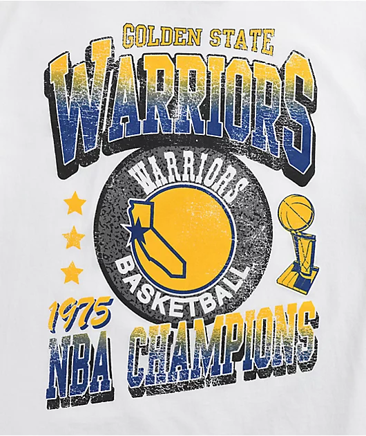 From Mitchell & Ness Apparel comes the kids Warriors Champs t-shirt in a white colorway, featuring a screen-printed graphic of the Warriors NBA logo, and \”1975 NBA Champions\” script below.