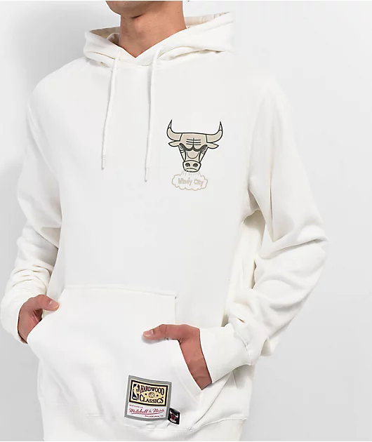 From the official Mitchell & Ness and NBA collaboration comes the Bulls hoodie in a cream colorway, adorned on the left of chest with a bull huffing out breath that reads, \”Windy city.\” This cotton-poly hoodie features a classic pullover construction