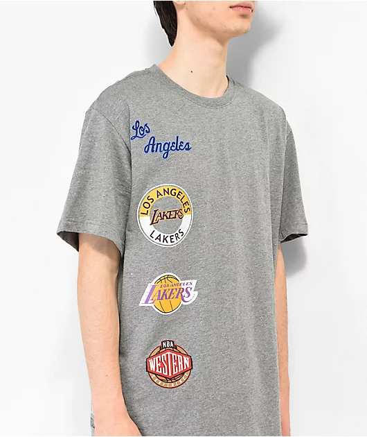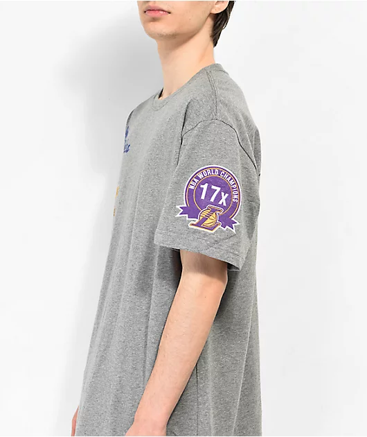 The Lakers Patch t-shirt from the official Mitchell & Ness and NBA collaboration comes in a grey colorway with screen-printed team logos down the right side, script on the back, and a 17x World Championship patch on the left sleeve for bold Lakers sup