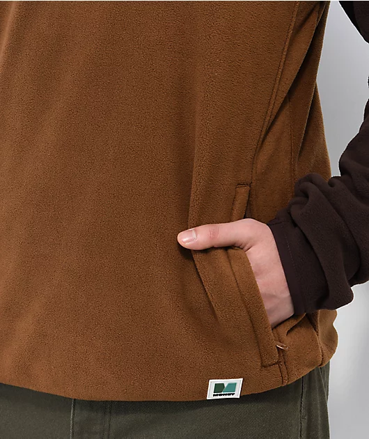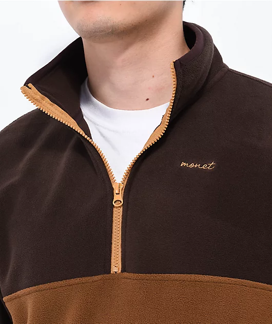 The Linear tech fleece from Monet comes in a split block brown colorway, showing a dark brown at the top and sleeves with a lighter brown at the torso. This warm winter jacket is made with a soft fleece construction for the coming winter days, giving a ha