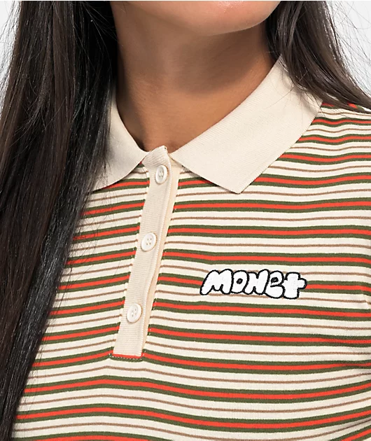 Monet Skateboards offers the Madina Striped crop polo t-shirt in a tan colorway with accents of red, green, and brown in horizontal striping throughout. A turndown collar with a three button closure offers a classic look, while a slim, cropped fit ad