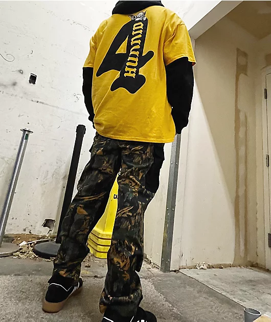 Taking inspiration from military surplus fatigues, the Stash cargo pants from Monet Skateboards feature a hunter camo pattern throughout with black color block accents on the thighs and knees. Subdued green, yellow and brown tones can be seen through